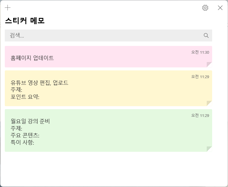 스티커 메모 앱을 열면 기본적으로 하나의 스티커 메모가 표시됩니다. 왼쪽 상단의 더하기 버튼 [+]을 눌러서 스티커 메모를 추가할 수 있습니다. 메모 우측 상단에 있는 세 개의 점 [...]을 클릭하고 [노트 목록]을 선택하면 작성된 스티커 메모의 목록이 모두 나타납니다.