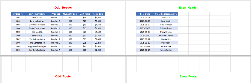 Spire.XLS에서 DifferentOddEven 속성은 홀수 및 짝수 페이지에 대해 다른 머리글과 바닥글을 활성화합니다. OddHeaderString 및 EvenHeaderString 속성은 각각 홀수 및 짝수 페이지에 대한 사용자 지정 머리글을 설정합니다. 마찬가지로 OddFooterString 및 EvenFooterString 속성은 홀수 및 짝수 페이지에 대한 사용자 지정 바닥글을 설정합니다.