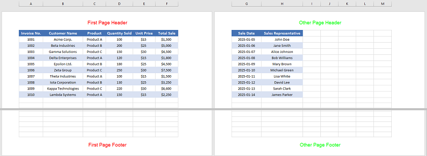 다음 코드는 Python에서 Excel 파일의 첫 페이지에 다른 머리글과 바닥글을 삽입하는 방법을 보여줍니다.