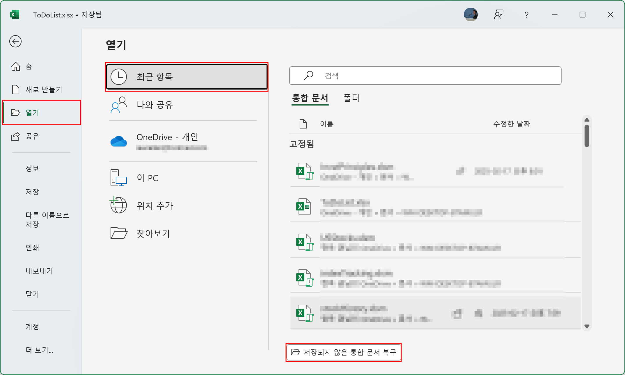 (2) [열기] - [최근 항목]을 클릭합니다. 하단에서 [저장되지 않은 통합 문서 복구]를 선택합니다.