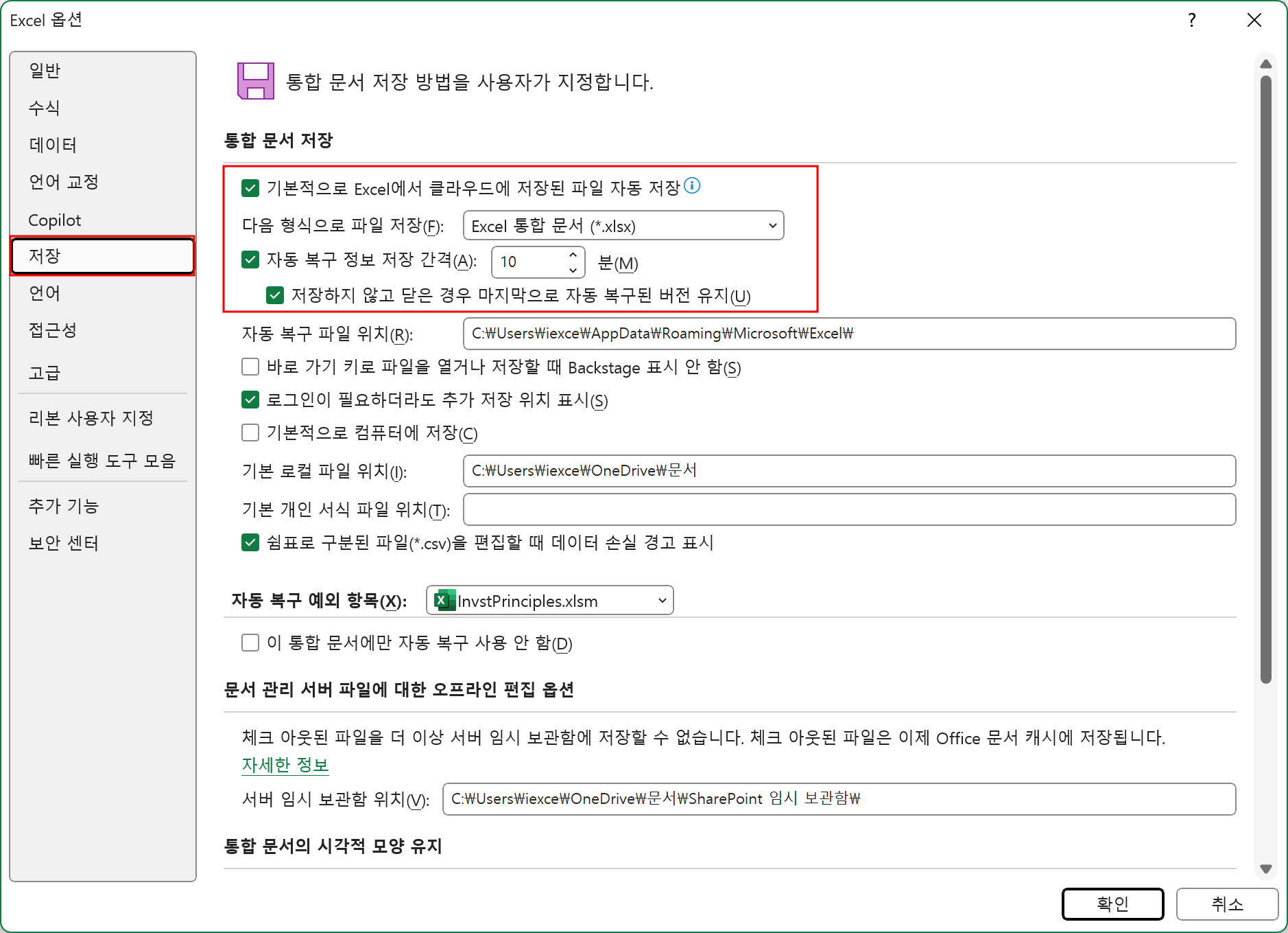 (2) [Excel 옵션] 대화상자의 [저장] 탭에서 "자동 복구" 및 "자동 저장" 관련 확인란을 선택합니다.
