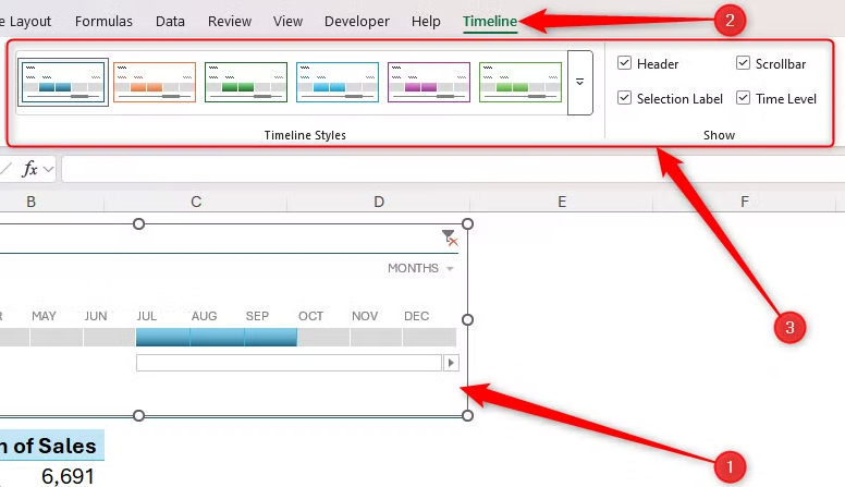 타임라인의 크기를 조정하고 위치를 변경하는 것뿐만 아니라 보기 좋게 서식을 지정할 수도 있습니다. 타임라인을 선택하면 Excel에서 타임라인 탭이 리본에 추가됩니다. 여기에서 표시 그룹에서 옵션을 선택 및 선택 해제하여 표시할 레이블을 선택하거나 타임라인 스타일 그룹에서 다른 디자인을 선택할 수 있습니다.