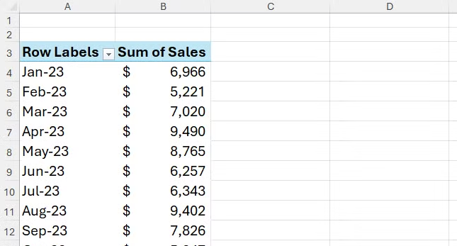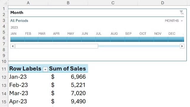 이제 타임라인을 사용하여 피벗 테이블에서 선택한 데이터를 표시할 수 있습니다. 예를 들어 2024 레이블 아래에서 'JUL'을 클릭하면 2024년 7월의 데이터만 표에 표시됩니다.