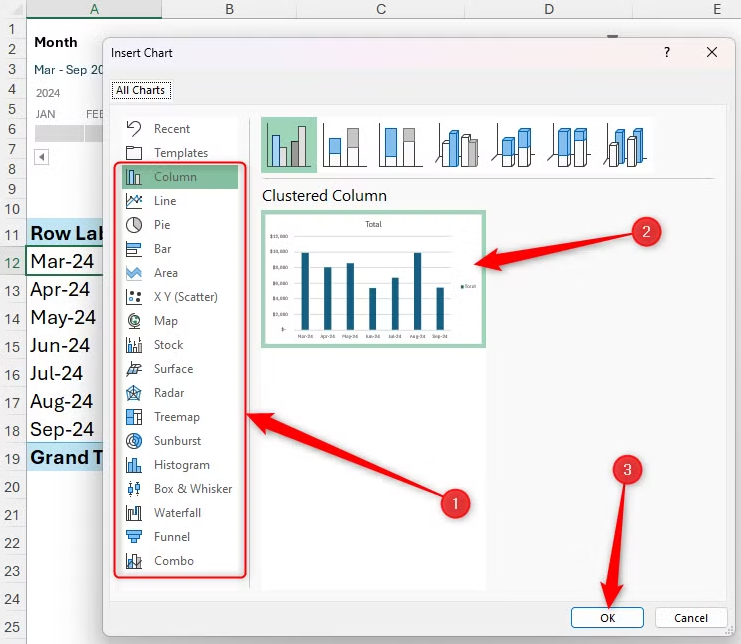 이제 차트 삽입 대화상자의 왼쪽 메뉴에서 차트 유형을 선택하고 오른쪽 선택기 영역에서 차트를 선택합니다. 여기서는 간단한 클러스터형 열 차트를 선택했습니다. 그런 다음 [확인]을 클릭합니다.