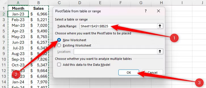 그런 다음 대화 상자에서 제목을 포함한 전체 데이터 범위가 선택되었는지 확인하고 데이터와 타임라인을 원하는 위치에 따라 '새 워크시트' 또는 '기존 워크시트' 중 하나를 선택하고 [확인]을 클릭합니다.