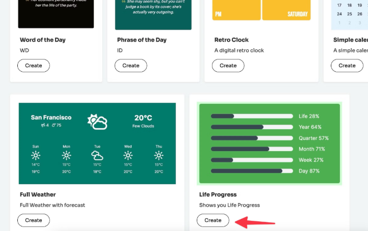 (1) 위젯박스로 이동하여 위젯 목록을 선택하세요. Life Progress 옆의 '만들기'를 클릭합니다.