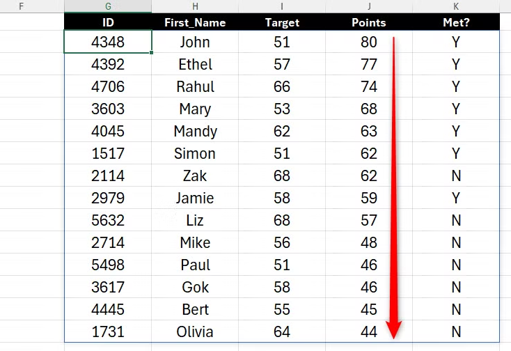 이 예시에서는 T_Targets라는 Excel 표가 주어졌고, Points 열을 기준으로 데이터를 정렬해 달라고 요청받았다고 가정해 보겠습니다. 동시에, 정보의 순서가 변경되지 않아야 하므로 원본 표는 그대로 유지해야 합니다.
