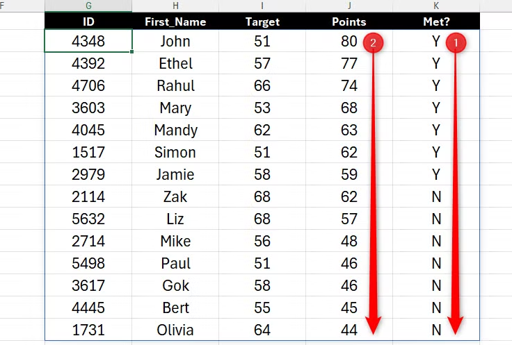 - -1: Excel에서 T_Targets[Points]를 내림차순으로 정렬하도록 지시