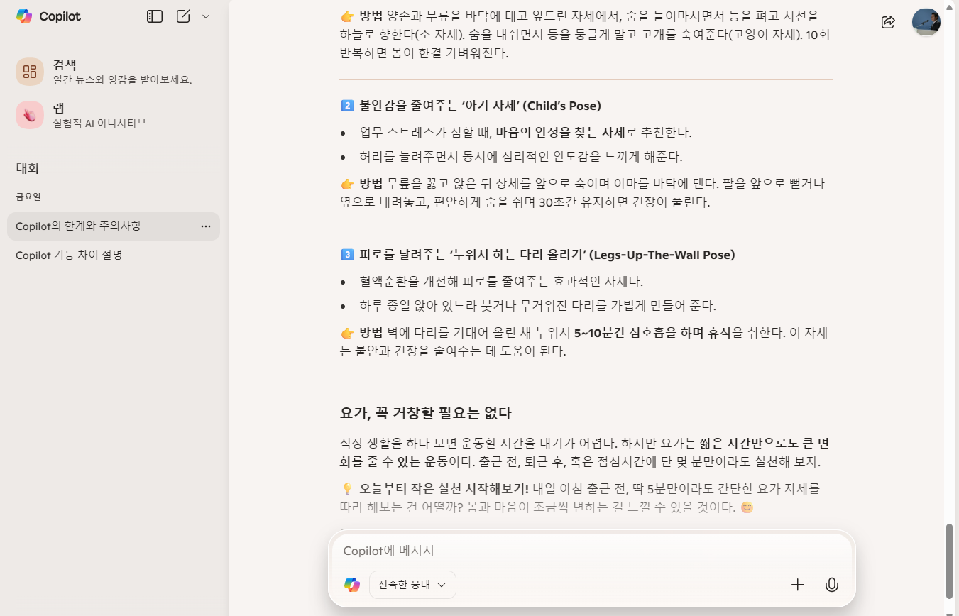 Copilot은 페이지 기능을 통해 더욱 집중할 수 있는 등 여전히 사용할 만한 유용한 기능들이 많습니다. 또한 추천 주제를 통해 더 쉽게 조사할 수 있을 뿐만 아니라, 호기심을 더욱 자극할 수도 있습니다.