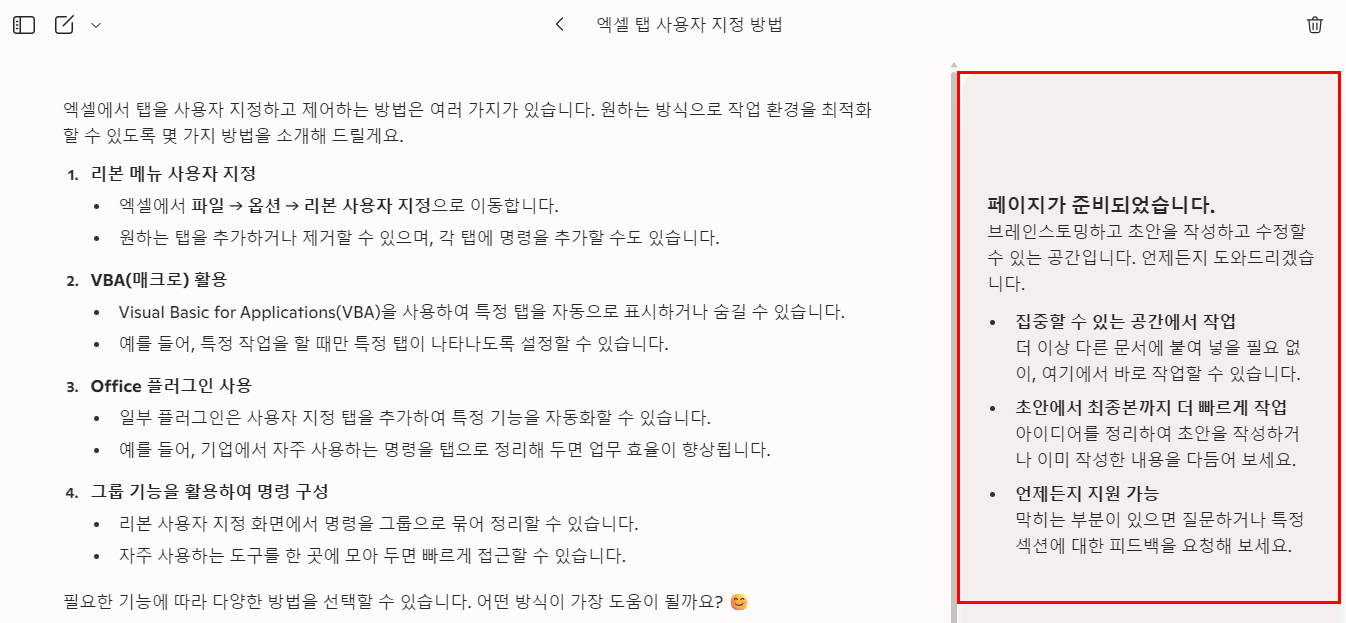 일반적인 토론만으로도 기본적인 정보를 얻을 수 있지만, 때로는 더 깊이 있는 대화를 나누고 싶을 때가 있습니다. AI 도구는 아이디어를 떠올리는 데 매우 유용하며, Copilot의 페이지(Pages) 기능은 바로 이러한 작업에 적합합니다.