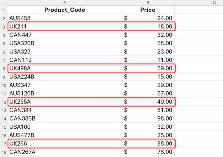 - "UK*":1 Excel에서 "UK"로 시작하고 그 뒤에 여러 문자가 오는 A2~A18의 모든 셀을 찾도록 지시
