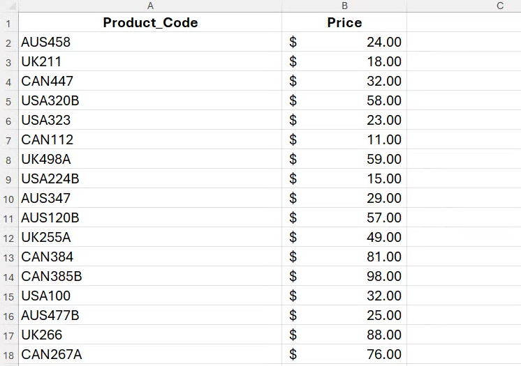 이 제품 코드 목록에서 시작 부분의 문자는 제품이 제조된 곳을 나타냅니다(AUS는 호주, UK는 영국, USA는 미국, CAN은 캐나다). 첫 번째 숫자는 해당 매장 부서를 나타냅니다(1은 의류, 2는 가정용품, 3은 스포츠용품, 4는 정원용품). 끝에 문자가 있는 코드는 국내 판매 전용(A) 또는 국제 판매 전용(B)을 나타냅니다.