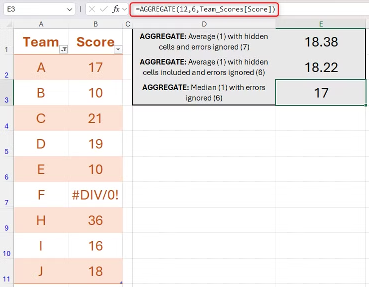 =AGGREGATE(12, 6, Team_Scores[Score])
