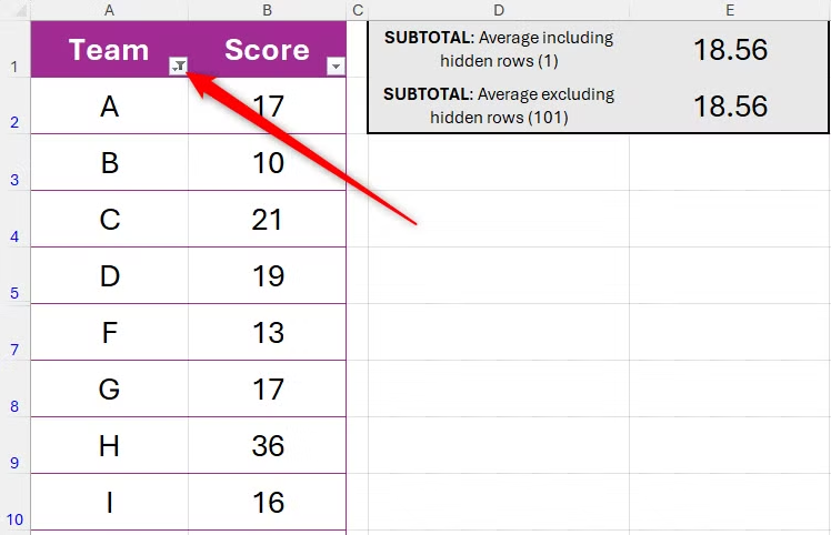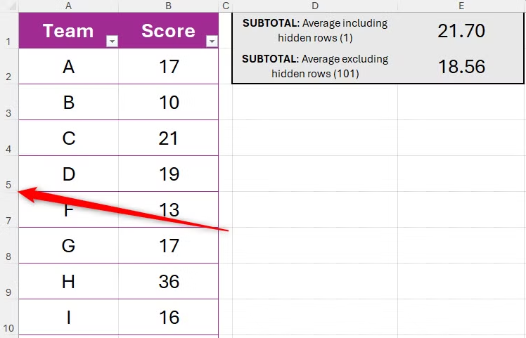 그러나 필터를 사용하여 팀 E의 점수를 숨기면 필터링된 값을 SUBTOTAL에 포함할 방법이 없으므로 두 소계가 모두 같아집니다.