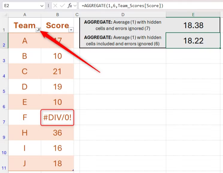 E3 셀에 입력하면 열 B의 모든 값의 평균(인수 a = 1)이 반환됩니다. 여기에는 필터링된 행 8의 값과 오류(인수 b = 6)가 포함됩니다.