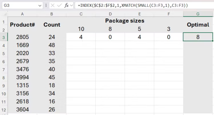 다음으로, G3 셀에서 해당 제품에 가장 적합한 포장 크기를 Excel에서 확인하도록 설정합니다. 이를 위해 INDEX와 XMATCH를 사용합니다.