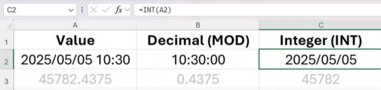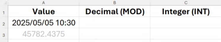 같은 방식으로 MOD와 INT를 사용하여 날짜-시간 값을 분할할 수 있습니다. 여기서 A2 셀에는 날짜와 시간이 포함되어 있고, 셀 A3에는 해당 일련 번호가 포함되어 있습니다.