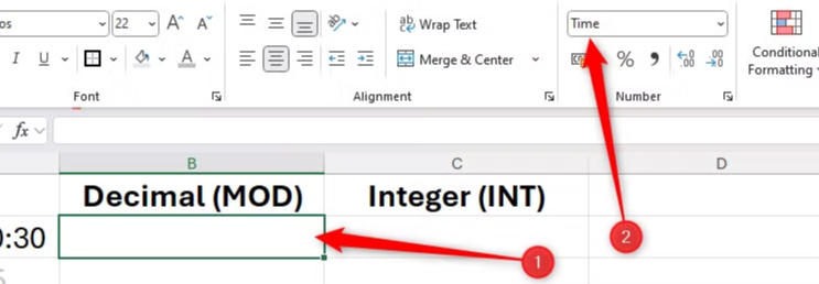 A3 셀의 일련 번호에서 45782는 날짜를 나타내고 0.4375는 시간을 나타냅니다. MOD와 INT를 사용하여 이를 나눌 수 있습니다 B2 셀을 선택하고 리본의 홈 탭에 있는 숫자 그룹에서 숫자 형식을 "시간"으로 변경합니다.