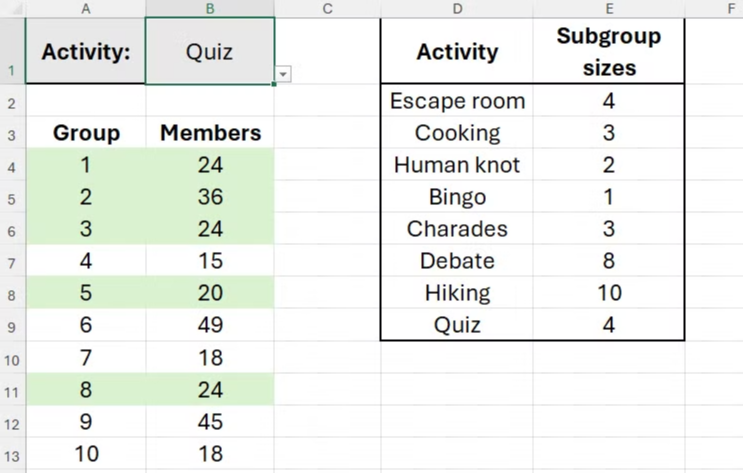 이제 B1 셀의 드롭다운 메뉴에서 활동을 선택하면 선택한 서식에 따라 해당 활동에 참여할 수 있는 그룹이 강조 표시됩니다. 이 예시에서는 그룹 1, 2, 3, 5, 8이 퀴즈에 참여할 수 있는데, 각 그룹의 총 구성원 수가 이 활동에 필요한 하위 그룹 크기로 나누어 떨어지기 때문입니다.