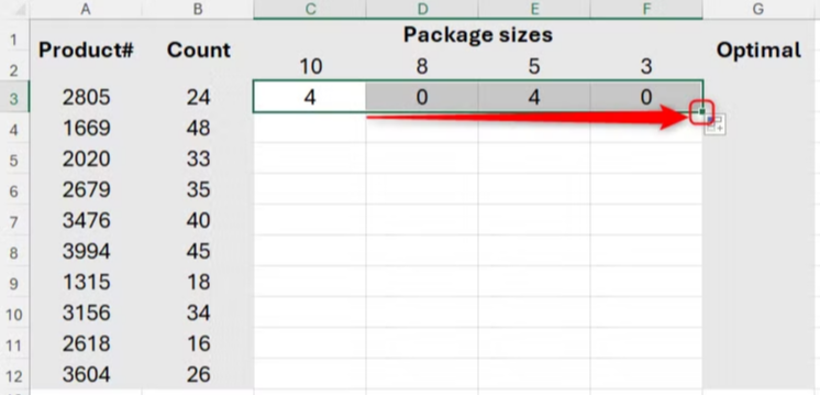 C3 셀의 채우기 핸들을 클릭하고 오른쪽으로 끌어 행을 완성하면 8개 또는 3개의 공백이 있는 패키지를 사용하는 것이 이 제품에 이상적임을 알 수 있습니다.