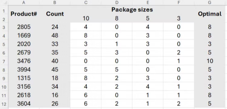 다양한 품목을 포장하여 배포하고 싶다고 가정해 보겠습니다. A열에는 제품 ID, B열에는 각 제품의 개수, 그리고 2행에는 다양한 포장 크기가 표시됩니다. 각 제품의 개수에 따라 최적의 포장 크기를 계산하는 것이 목표입니다.