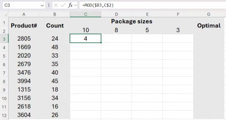 마지막으로, C3:G3 셀을 선택하고 채우기 핸들을 두 번 클릭하여 범위 내 나머지 행에 모든 수식을 복사합니다. C3:F12 셀에서 MOD 함수를 사용하면 G열에서 각 제품에 사용할 최적의 패키지 크기를 알 수 있으며, C~F열에서 각 제품을 살펴보면 이 최적의 패키지 크기를 사용한 후 남은 패키지의 수(있는 경우)를 확인할 수 있습니다.