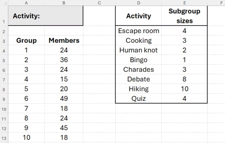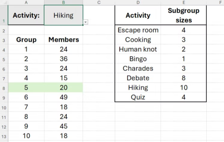 Excel에서 B1 셀에서 선택한 활동에 필요한 하위 그룹 크기로 전체 그룹 크기를 나눌 수 있는 형식으로 그룹을 서식 지정하려는 것입니다.