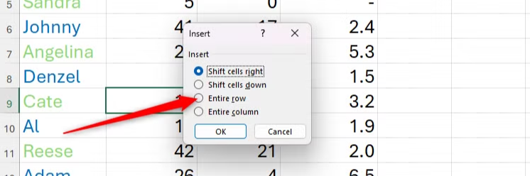 Excel 대화 상자에서 도구를 더블 클릭하면 [확인] 버튼을 클릭하지 않아도 됩니다. 예를 들어, 셀을 우클릭하고 [삽입]을 선택한 후 [행 전체]를를 두 번 클릭하면 해당 옵션을 활성화하고 대화 상자를 닫을 수 있습니다.