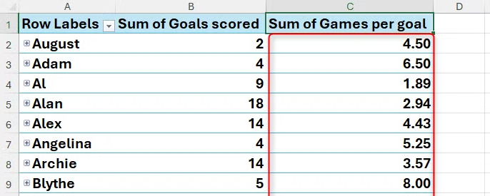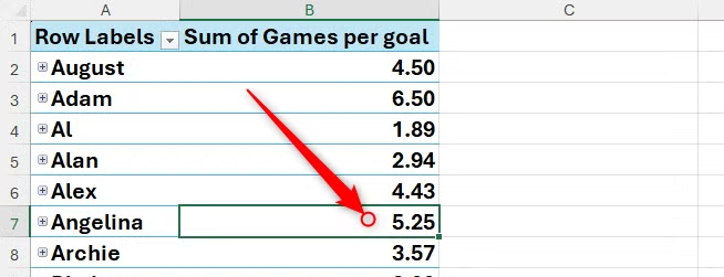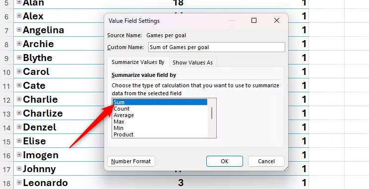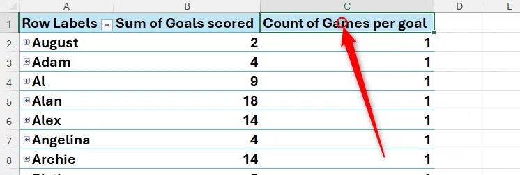 Excel에서 피벗 테이블을 사용할 때 사람들이 겪는 가장 일반적인 어려움 중 하나는 쉬운 분석을 위해 데이터를 조정하는 데 적합한 설정을 어디에서 찾아야 하는지 아는 것입니다. 이 예에서, 골당 경기 수 열은 합계가 아닌 개수로 표시되므로 이를 변경해야 합니다.