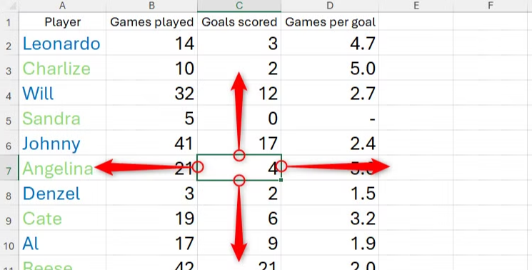 다음 예에서, 셀 C7의 위쪽 가장자리를 더블 클릭하면 셀 C1이 활성화되고, 오른쪽 가장자리를 더블 클릭하면 셀 D7로 이동하고, 왼쪽 가장자리를 더블 클릭하면 셀 A7로 이동하고, 아래쪽 가장자리를 더블 클릭하면 범위의 아래쪽 가장자리인 셀 C27이 활성화됩니다.