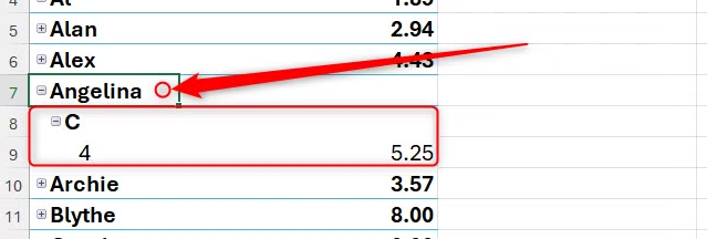 피벗 테이블 필드 머리글을 두 번 클릭하는 것 외에도 피벗 테이블의 다른 부분을 두 번 클릭하여 더 많은 정보를 표시하거나 숨길 수 있습니다. 여기서 행 레이블 중 하나를 두 번 클릭하면 해당 행에 대한 새로운 세부 정보 수준이 열립니다.