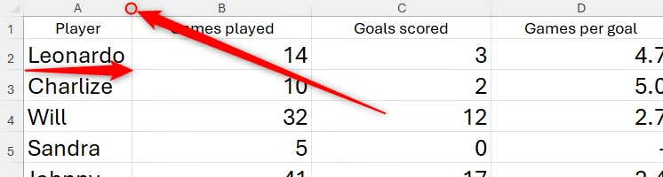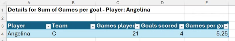 반면, 통계(예: B열의 골당 경기 수)가 포함된 셀을 더블 클릭하면 피벗 테이블에 포함되지 않은 데이터를 포함하여 해당 행과 관련된 모든 원본 데이터가 포함된 새 시트가 열립니다.