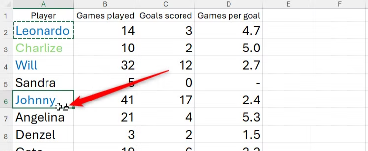같은 방법을 사용하여 행의 높이를 자동으로 조절할 수도 있습니다. 두 행 머리글 사이의 경계를 두 번 클릭하면 그 위에 있는 행의 크기가 해당 행에 포함된 가장 높은 요소에 맞춰 조절됩니다.