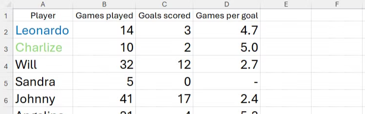 Angelina의 경기당 득점 합계를 더블 클릭하면 이렇게 표시됩니다. 안젤리나의 모든 통계를 보여주는 새 시트입니다. 이는 개별화된 보고서를 만드는 데 유용합니다.