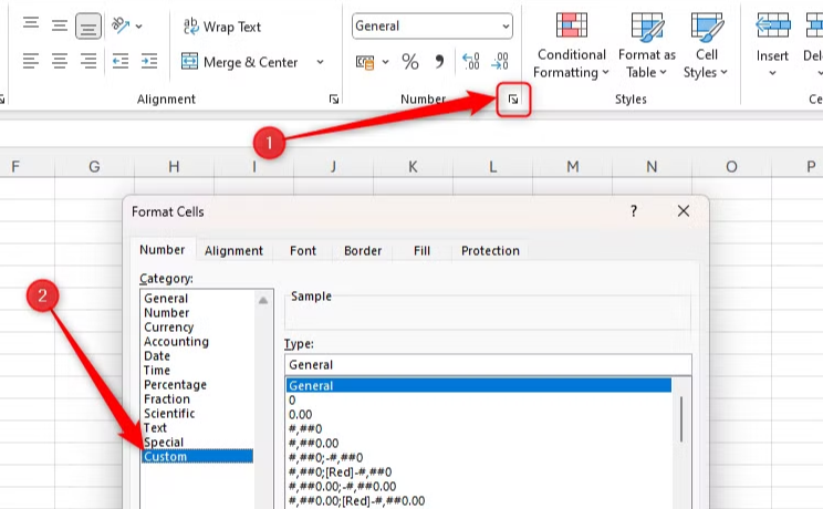 숨겨진 숫자 서식 중 하나는 사용자 지정으로, Excel의 표준 숫자 서식에 나열되지 않은 방식으로 셀 서식을 지정할 수 있습니다. 입력하려는 서식을 적용할 셀을 선택하고 [홈] 탭 - [표시 형식] 그룹의 모서리에 있는 대화 상자 시작 관리자를 클릭합니다. Ctrl + 1키를 눌러도 됩니다.