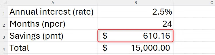 그러나 보증금과 이사할 때 불가피하게 발생하는 기타 비용을 충당하기 위해 총 15,000달러를 모으는 것이 목표이므로 이 목표를 달성하려면 2년간 매달 얼마를 저축해야 하는지 계산해야 합니다. 이때 Excel의 목표 찾기 도구가 유용합니다.