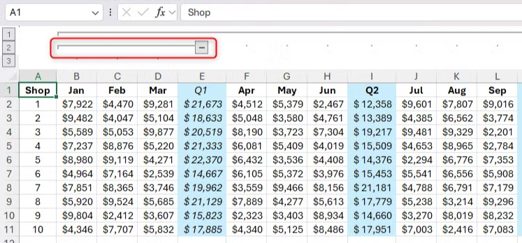 Q1에 대한 하위 그룹을 만들려면 B열부터 D열까지 선택하고 [데이터] 탭에서 [그룹]을 클릭합니다.