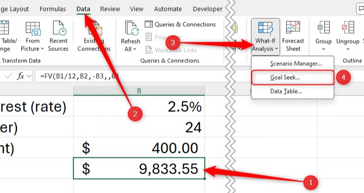 Excel의 잘 알려지지 않은 목표 찾기 도구는 최종 목표는 알지만 달성 방법을 모를 때 도움이 됩니다. 2년 후에 새 집을 구입할 계획이라고 가정해 보겠습니다. 현재 연 2.5%의 이자율로 매월 400달러를 저축하고 있으므로 미래 가치(FV) 기능을 통해 계산한 결과 2년 동안 9833.55달러를 저축할 수 있습니다.