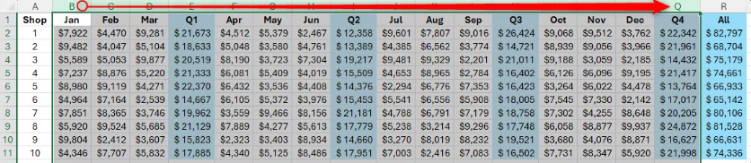 많은 열이 포함된 Microsoft Excel 스프레드시트에서 작업하는 경우, 데이터를 읽기 위해 좌우로 반복해서 스크롤하는 것이 지겨울 수 있습니다. 또한 특정 열이 항상 표시되어야 할 필요가 없는 경우도 있습니다. 다양한 매장의 월별 판매 수치가 포함된 통합 문서가 있고, 가장 오른쪽 열에 연간 총계가 있다고 가정해 보겠습니다.
