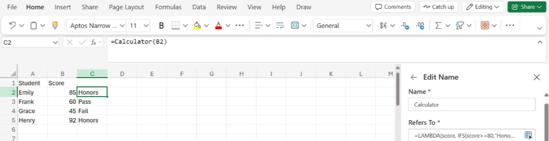 =LAMBDA(score, IFS(score>=80,"Honors", score>=50,"Pass", score < 50,"Fail"))