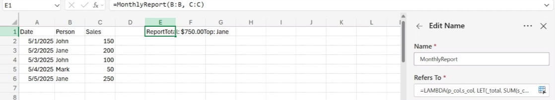 이 함수를 MonthlyReport라는 이름으로 저장하고 아래 수식을 사용하여 호출하세요. 셀 하나에 함수 하나만 추가하면 완전한 보고서가 생성됩니다.