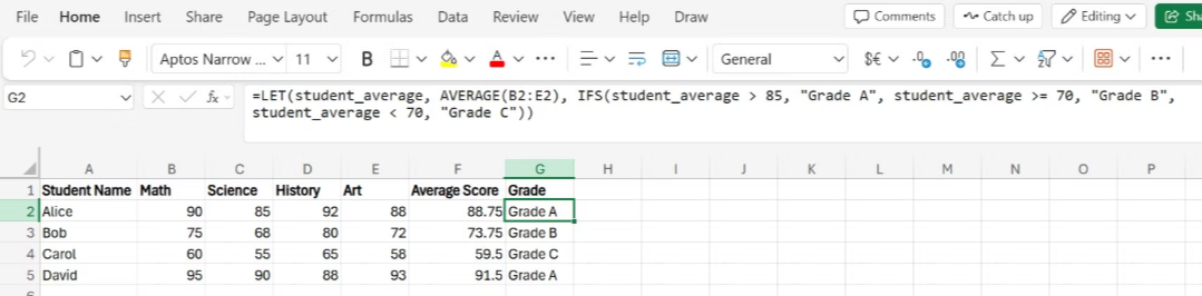 예를 들어, LET를 사용하여 학생의 점수를 평가해 보겠습니다. LET가 없으면 공식이 너무 복잡해질 것입니다.