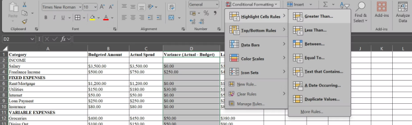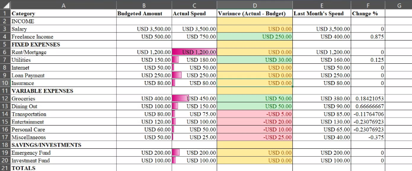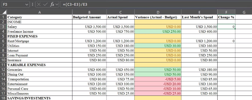 20가지 항목에 대한 실제 지출과 예산을 직접 비교하는 대신, 조건부 서식을 사용하면 스프레드시트를 더욱 다채롭게 꾸밀 수 있어 지출이 초과된 부분과 절약된 부분을 바로 파악할 수 있습니다. 제 월 예산에는 예산과 실제 지출의 차이를 보여주는 '차이' 열이 있습니다. 그런 다음 조건부 서식을 사용하여 복잡한 작업을 처리했습니다.