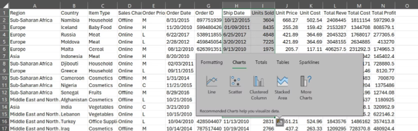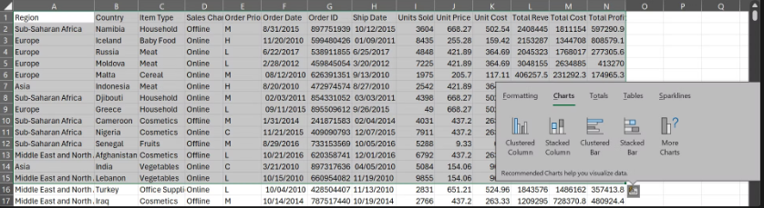 각 범주 내에서 특정 데이터에 맞는 옵션을 찾을 수 있습니다. 판매 기록 스프레드시트에서 14개 열이 모두 포함된 15개 행을 강조 표시했을 때 Excel은 차트 범주에서 클러스터형 세로 막대형, 누적 세로 막대형, 클러스터형 가로 막대형, 누적 가로 막대형 차트를 제안했습니다.