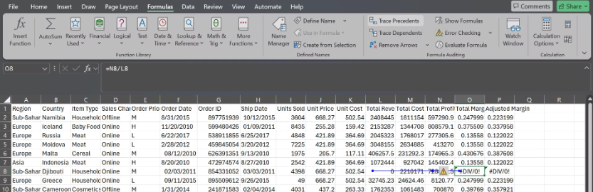 오류가 표시된 셀을 강조 표시하고 [수식] 탭으로 이동합니다. 참조되는 셀 추적을 클릭하면 Excel에서 잘못된 수식에 입력된 셀을 가리키는 화살표를 표시합니다. 일반적으로 문제는 즉시 발견됩니다. 총 수익이 0이거나, 빈 셀을 참조하거나, 셀에 숫자 대신 텍스트가 포함되어 있을 수 있습니다.