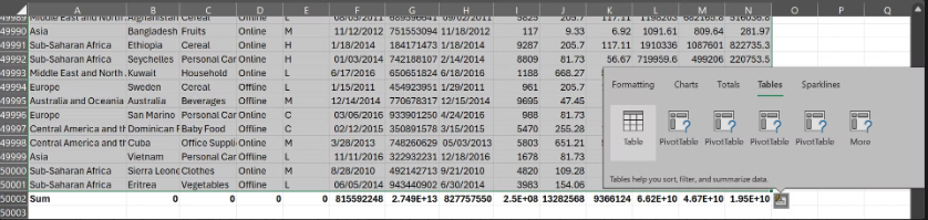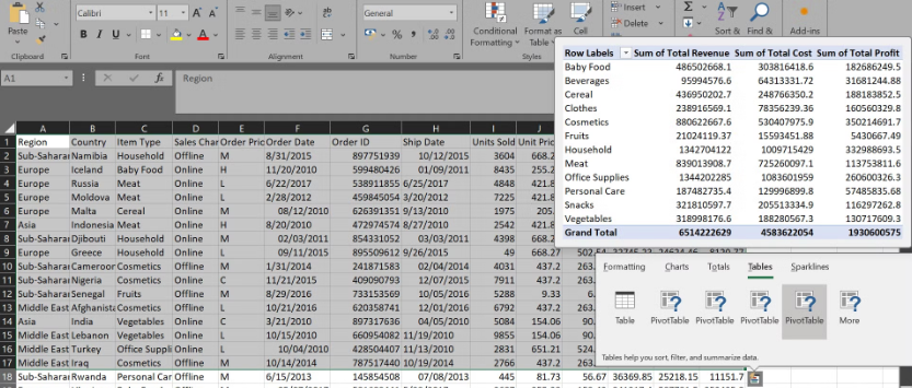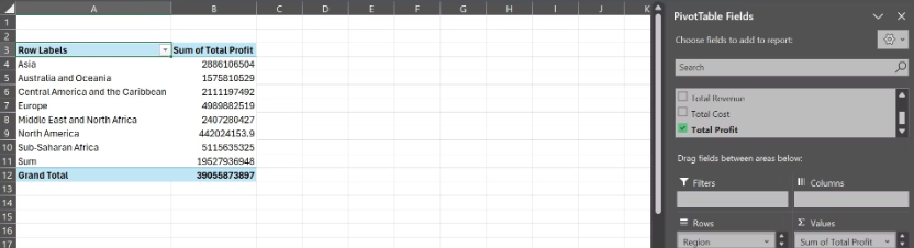 3만 행으로 구성된 판매 스프레드시트가 있고 상사가 지역별 총 이익을 보고 싶어한다고 가정해 보겠습니다.