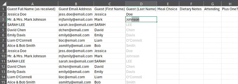 Jessica Doe나 Sarah Lee 처럼 전체 이름 열이 있고 별도의 열에 성만 입력해야 하는 경우, 각 이름을 직접 입력할 필요가 없습니다. Jessica Doe 옆 셀에 Doe를 입력하고 Enter 키를 누른 후 다음 셀에 Lee를 입력하기 시작하면 됩니다. Excel에서 사용자가 입력하는 내용을 인식하고 열 전체를 자동으로 완성해 줍니다.