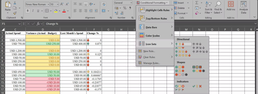 아이콘 세트는 추세를 추적하는 데 유용합니다. '지난달 대비 변동' 열에 아이콘 세트를 추가하면 지출이 크게 증가한 곳에는 위쪽 화살표, 소폭 증가한 곳에는 가로 화살표, 감소한 곳에는 아래쪽 화살표가 표시됩니다.