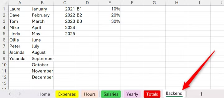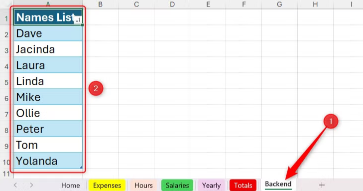 (1) Backend 워크시트에서 열의 각 셀에 이름 목록을 입력하고, 이 목록을 Excel 표 형식으로 서식을 지정합니다. 또한, 필터 버튼을 클릭하고 이름을 알파벳순으로 정렬합니다.