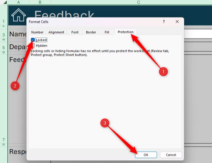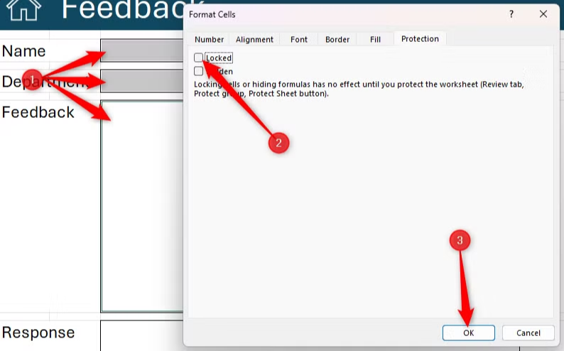 (2) 이제 다른 사용자가 입력하고 수정할 수 있도록 할 셀의 잠금을 해제해야 합니다. 잠금을 해제하려면 열어 둘 첫 번째 셀(C3 셀)을 선택하고 Ctrl 키를 누른 상태에서 나머지 셀(C5 및 C7 셀)을 선택합니다. 그런 다음 Ctrl + 1 키를 눌러 셀 서식 대화 상자를 다시 열고 이번에는 "잠김"의 선택을 해제한 후 "확인"을 클릭합니다.